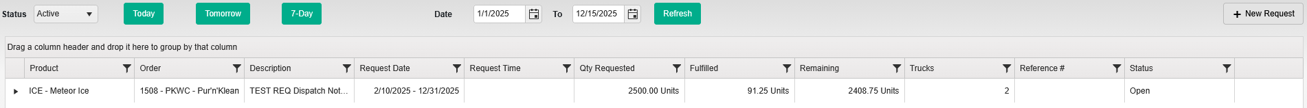 Included are a few quick one-click selections to review the most recent Requests. Clicking the **\[Today]**, **\[Tomorrow]**, or **\[7-Day]** options will automatically refresh the page to display these specific filtered Requests. You can also use the date selection and manually refresh the page with the **\[Refresh]** button to view older requests.\