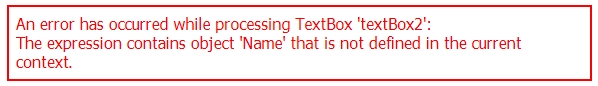 "An error has occurred while processing TextBox 'textBox2': The expression contains object 'Name' that is not defined in the current context."