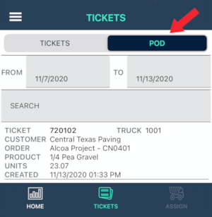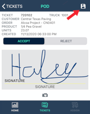 Mark tickets as "Delivered" or "Rejected" using Proof of Delivery under the Tickets page. Note: The feature is only available if your User Role is for a Truck.