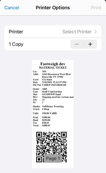Once you finish and tap "Create Load Ticket," you will be directed to the printing screen.