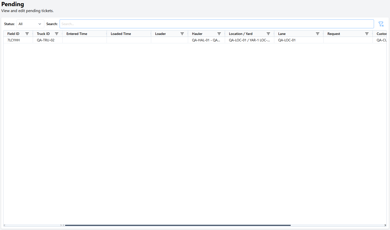 <table><thead><tr><th width="183">Field</th><th>Description</th></tr></thead><tbody><tr><td><strong>Field ID</strong></td><td>A unique identifier for the pending ticket.</td></tr><tr><td><strong>Truck ID</strong></td><td>The truck assigned to the pending ticket</td></tr><tr><td><strong>Entered Time</strong></td><td>The check-in time of the pending ticket. This will be blank if ticket was stashed, rather than checked-in.</td></tr><tr><td><strong>Loaded Time</strong></td><td>The time the pending ticket is marked as Loaded via the Fast-Weigh Loader Mobile App</td></tr><tr><td><strong>Loader</strong></td><td>The pending ticket's Loader from the Fast-Weigh Loader Mobile App</td></tr><tr><td><strong>Hauler</strong></td><td>The assigned Truck's Hauler</td></tr><tr><td><strong>Location /</strong> Yard</td><td>The Location &#x26; Yard assigned to the pending ticket</td></tr><tr><td><strong>Lane</strong></td><td>The lane the ticket was stashed on</td></tr><tr><td><strong>Request</strong></td><td>The assigned Request</td></tr><tr><td><strong>Customer</strong></td><td>The assigned Customer</td></tr><tr><td><strong>Order</strong></td><td>The assigned Order</td></tr><tr><td><strong>Product</strong></td><td>The assigned Product</td></tr></tbody></table>