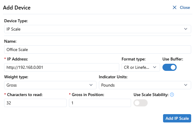 After selecting the device, you will enter the information for the related device, and then click the Add button. See below for an example for adding and testing an IP Scale.