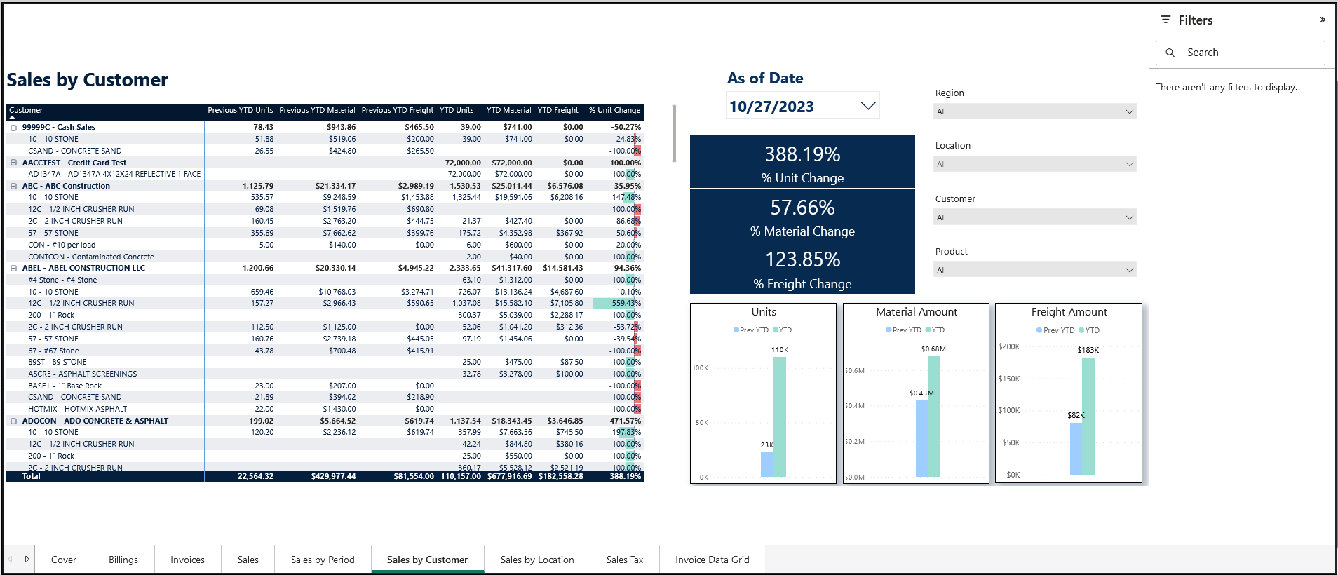 In the above image, we're using the *Billing and Sales* category, and have the *Sales by Customer* submenu selected. On the right section of this screen we have the option of filtering further to display information specific to this submenu. Each listing in the table to the left can also be collapsed to removing any unnecessary information.<br>