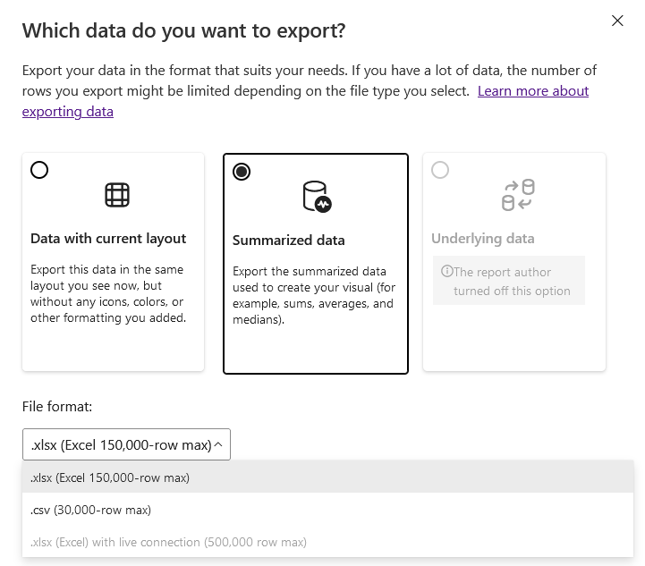 Exporting between selections will vary. Some tables will be available as they are displayed, some as a summary, and others as the Underlying data. Exports can be made in both .csv and .xlsx file types.