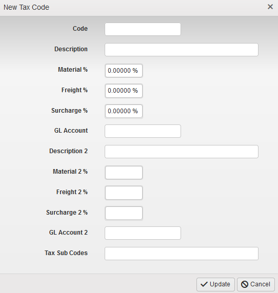 When entering a new tax code, you will enter the shorthand Code, description, and percentages for Material, Freight, and Surcharge as needed. If your accounting software utilizes GL, you can to enter that information as well, then click **\[✓ Update]** when finished. This information can be adjusted at any time by clicking the ![](https://490131596-files.gitbook.io/~/files/v0/b/gitbook-x-prod.appspot.com/o/spaces%2F0LJDMCSYOqplCEgCo73X%2Fuploads%2FASv04OYRL8KR45iCeaRq%2Fimage.png?alt=media\&token=c34fcdcf-fb63-4155-938d-b3e95d44879f) button.