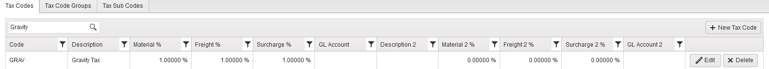 The table provides an overview of all tax codes created or imported to Fast-Weigh, and displays all available information entered.
